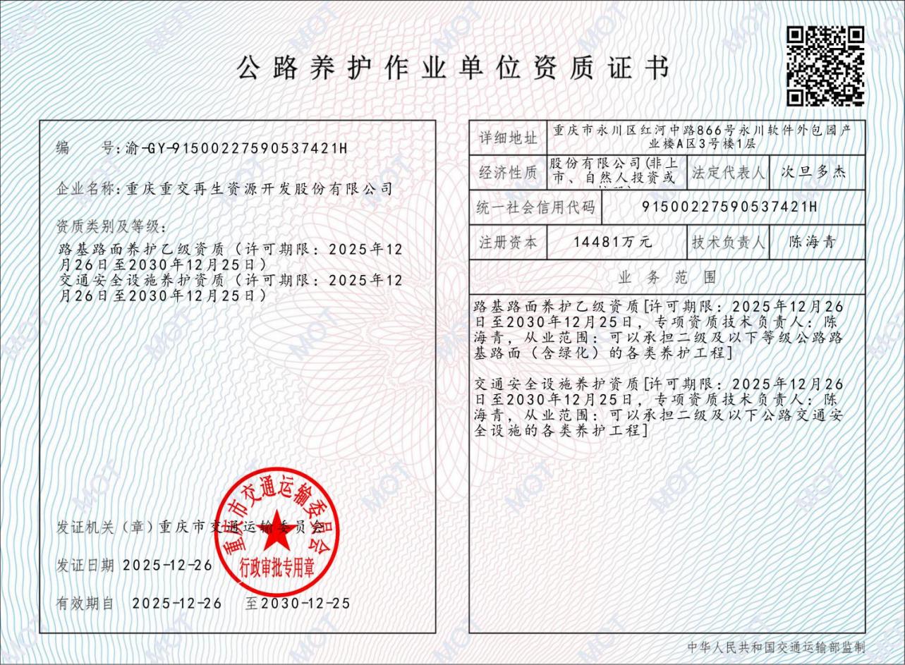 点击量:380新年伊始,万象更新。2026年岁序更替之际,重庆重交成功获批公路路基路面养护乙级资质和交通安全设施养护资质,为新一年的发展增添了强劲动力。两项资质的获批,标志着重庆重交正式进入具备专项作业资质的规范化养护企业行列,不仅进一步拓展了市场业务布局,更实现了核心竞争力的跨越式提升。 未来,重庆重交将以此次资质获取为新的发展起点,严格遵守行业规范与技术标准,充分发挥双资质的协同优势。我们将聚焦于路基路面养